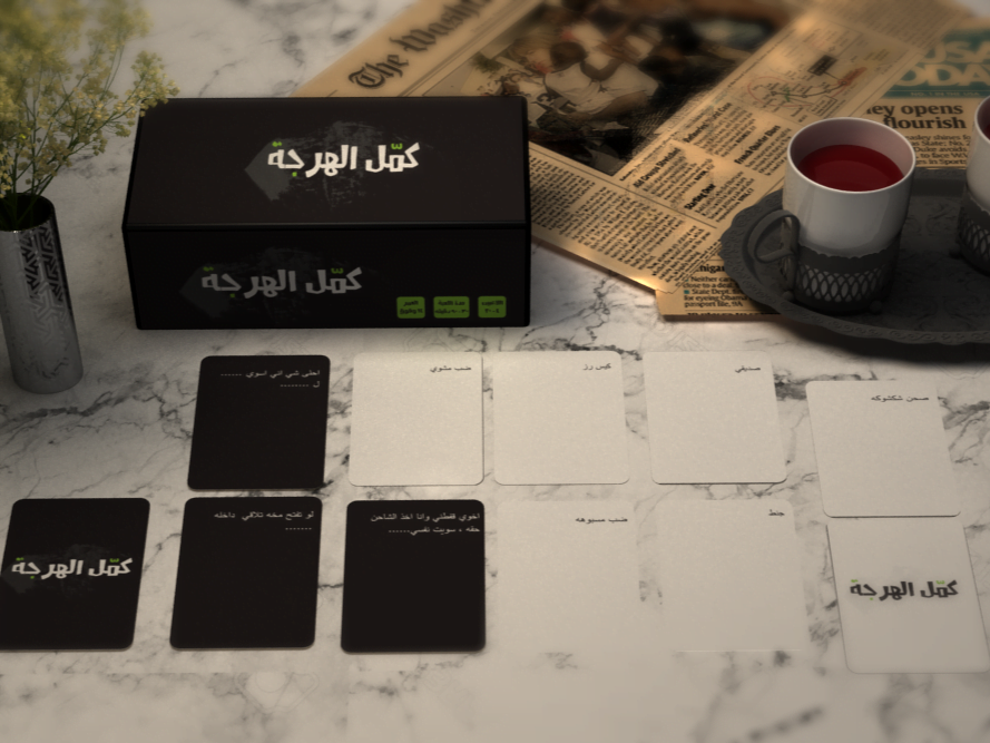 - اللعبة مكونة من 550 كرت، 150 كرت اسود تحتوي الهرجه و 350 كرت ابيض فيها تكملة الهرجة.